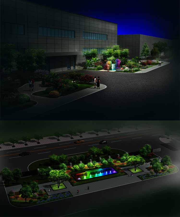 簡介—— 彩虹廠夜景照明設計,是結合廣場噴泉景觀,廣場樹木以及草坪的亮化,設計主要采用彩色燈光和暖色白光為主,中心已白光打亮整個廣場,照明路面,周邊樹木圍欄周圍采用線條燈勾勒出輪廓,在用照樹燈給樹木打亮,是廣場的夜晚更加璀璨。